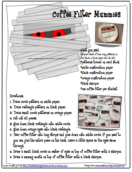 Happy Mummyween! We had our Halloween party today, put on by my room moms and little did I know they would be doing a Mummy Wrapping game. We had read the book Skippyjon Jones in Mummy Trouble and discussed what happened in the beginning, middle and end of the story. We made coffee filter mummies and wrote a retelling of the story. You can get your free template and directions to make your own mini mummy here at my Teachers pay Teachers store.